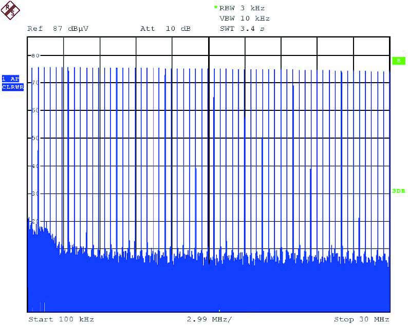 The main application of the 1313-C30M Comb Generators is to quickly verify conducted emissions test setups. It is designed to plug directly into the EUT powersocket of an LISN. The conducted noise output level of the Comb Generators are close to or above the CISPR 22 limits. Typical output plots are shown on the next page.
