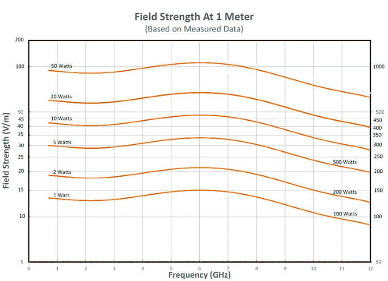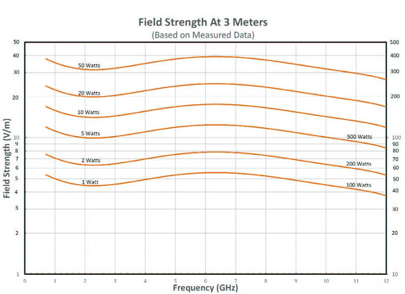Field strengths shown are typical for free space. Proximity to conductive surfaces and the presence of the device under test will influence actual levels.