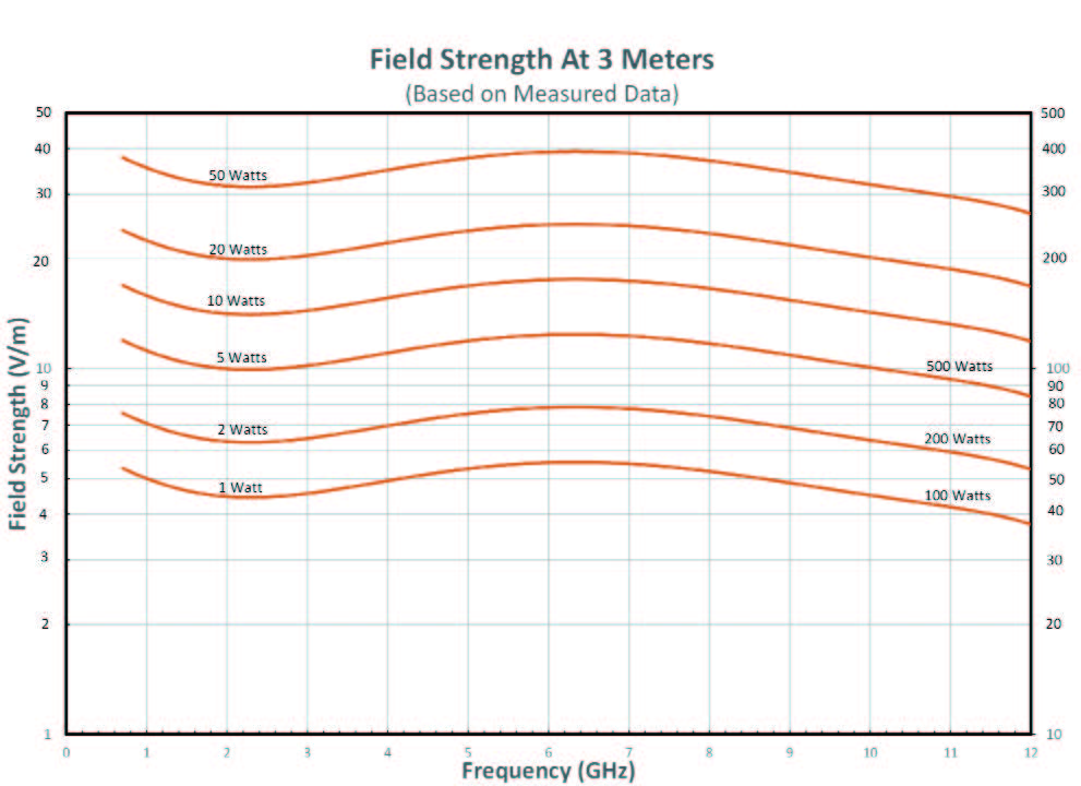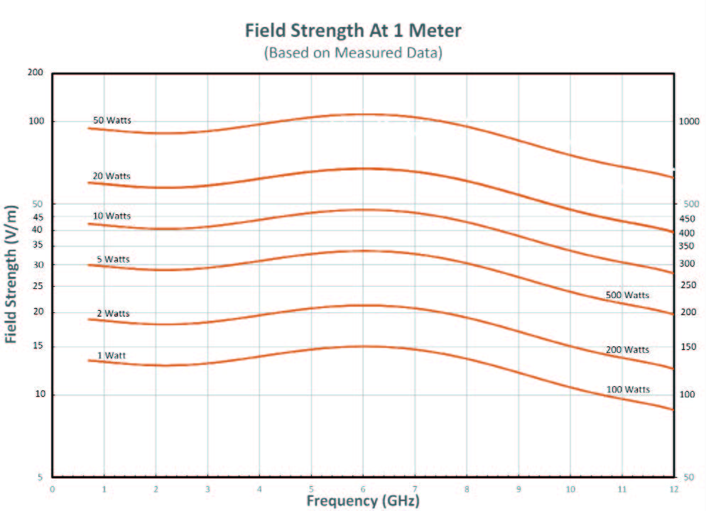Field strengths shown are typical for free space. Proximity to conductive surfaces and the presence of the device under test will influence actual levels.