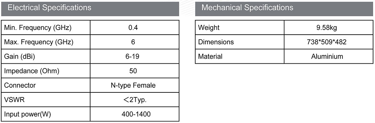 The Ultra wide-band dual ridged horn antenna OBH-460HG is designed for superior performance accross a wide range of frequency spectrum ensuring consistent signal strength. It can transmit a clear and precise signal even in a challenging environment. The gain increase with respect to the frequency up to approximately of 19dbi and a maximum power handling capability of upto 1400W.Especially, it performs even more outstandingly in the EMC/EMI test.